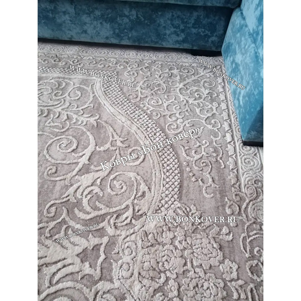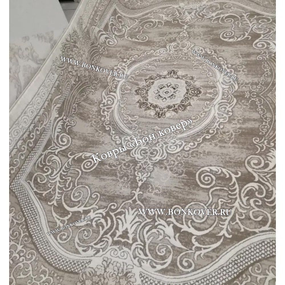 Долго выбирала, остановилась на данной модели. Ковер понравился, очень красивый праздничный, нежной расцветки сливочно кремовой. Ковёр средний плотности, к этому я была готова, т. к. вес ковра 9 кг, ковры аналогичных размеров более плотной набивки весят 12 кг. Слегка хамелионит, в дневное время цвет серый, под электрическим освещением более бежевый. Тактильно очень приятный, шелковистый, рисунок фактурный. -